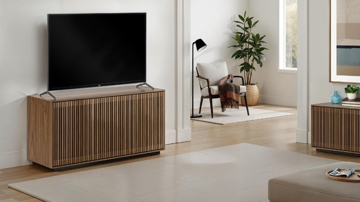 - Storage That Speaks Volumes: Oak hardwood slatted doors beautifully conceal contents while providing ventilation, acoustic transparency, and remote control accessibility.